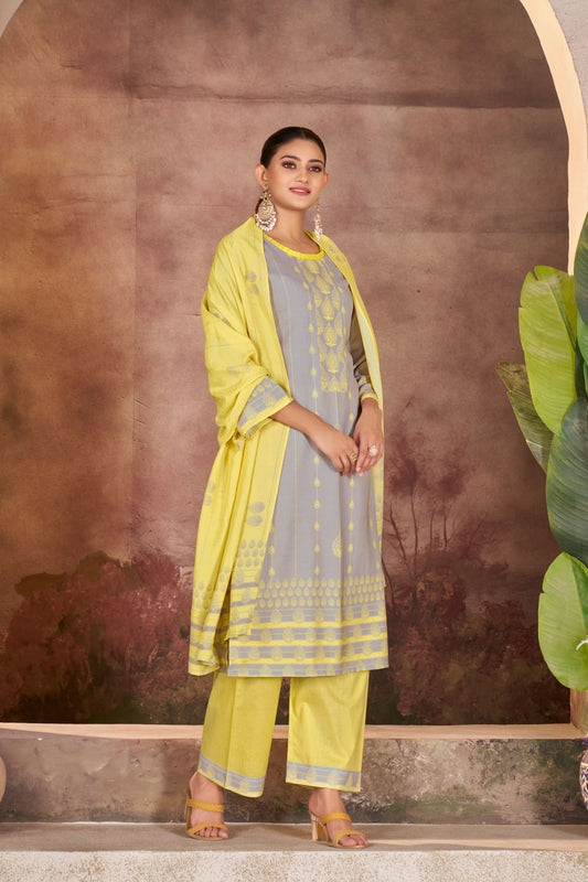 Grey & Yellow Printed Linen Suit Set with Dupatta