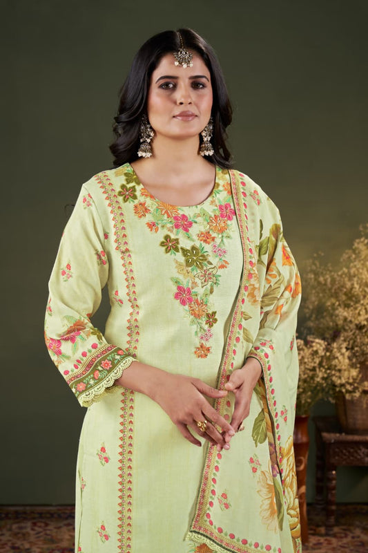 Pastel Green Floral Embroidered Linen Suit Set with Printed Dupatta | Elegant Festive & Daily Wear Ensemble