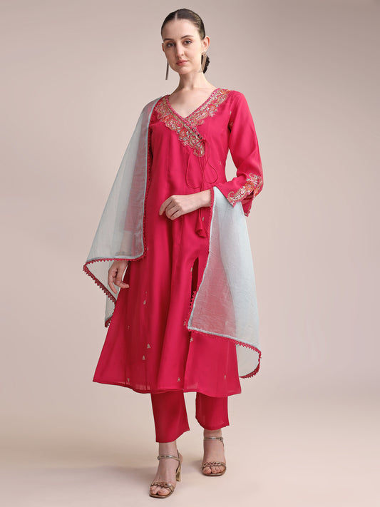 Rani Pink Roman Silk Embroidered Kurta Set with Contrast Organza Dupatta