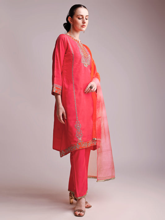Coral Pink Embroidered Silk Kurta Set with Contrast Orange Dupatta