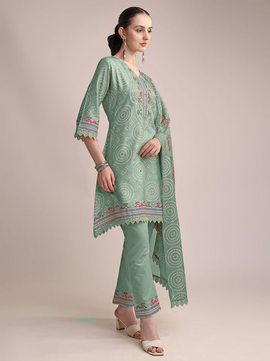 Graceful Sea Green Linen Printed Kurta Set with Embroidered Detailing & Matching Dupatta