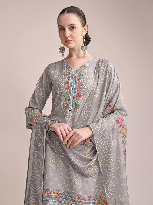 Elegant Grey Linen Printed Kurta Set with Multicolor Embroidery & Dupatta