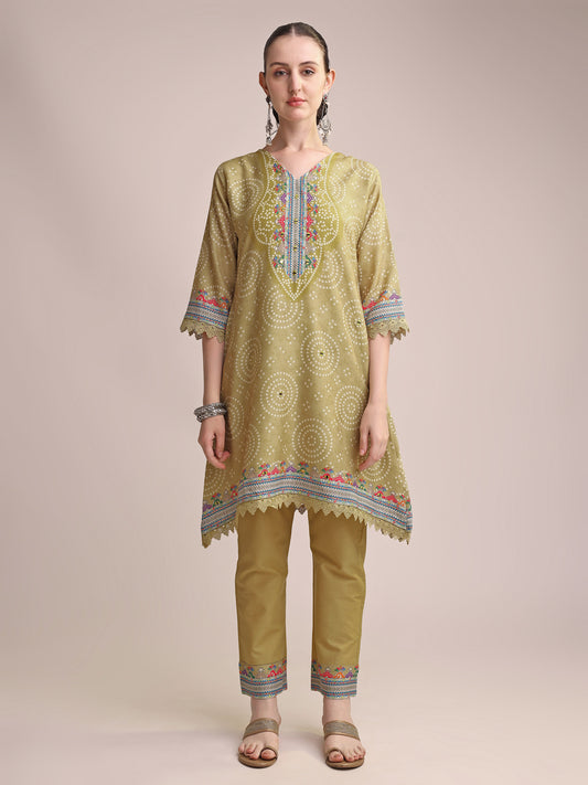 Mustard Yellow Linen Printed Kurta Set with Multicolor Embroidery & Matching Dupatta