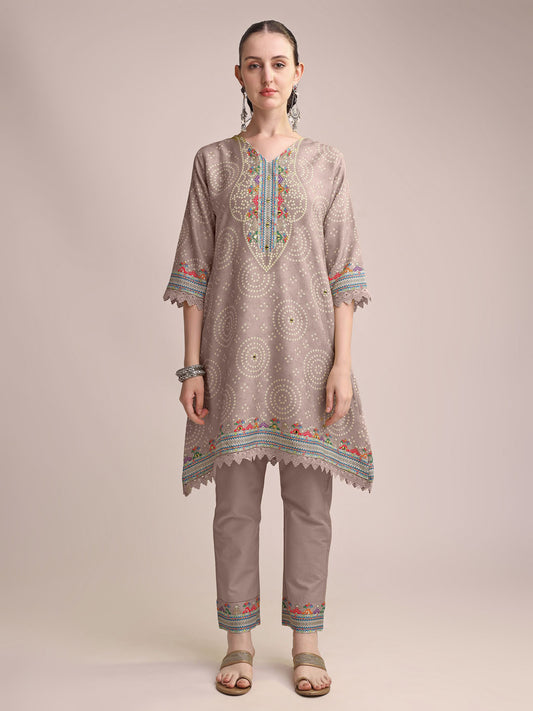 Elegant Taupe Linen Printed Kurta Set with Embroidered Detailing & Dupatta