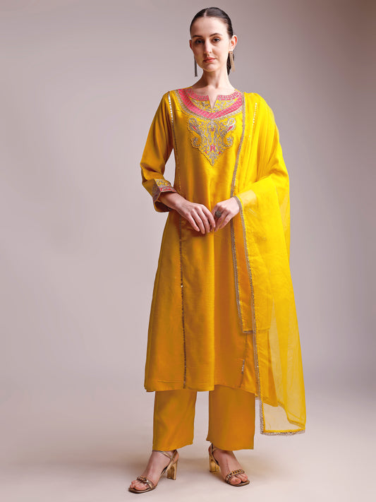 Mustard Yellow Embroidered Viscose Silk Kurta Set with Organza Dupatta