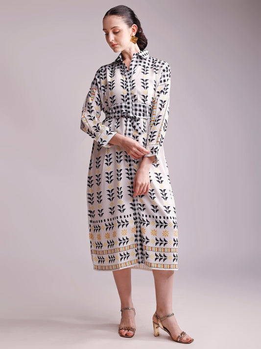 Off-White & Black Printed Shirt Dress with Waist Tie-Up