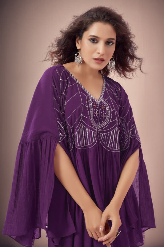Plum Purple Embellished Kaftan Co-ord Set with Flared Pants