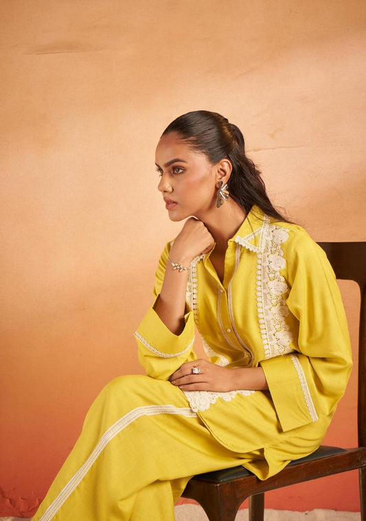 Mustard Yellow Lace Detailed Co-ord Set with Shirt Collar
