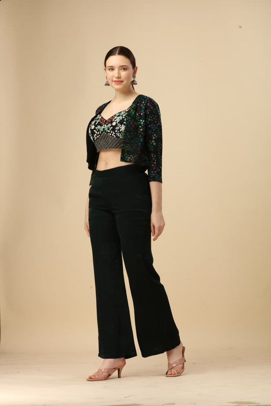 Black Embroidered Velvet Crop Top Co-ord Set with Printed Shrug