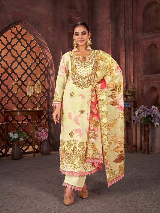 Lemon Yellow Floral Printed Cotton Suit with Golden Embroidery & Dupatta