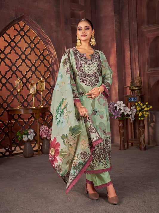 Sage Green Printed Cotton Suit with Embroidered Detailing & Floral Dupatta