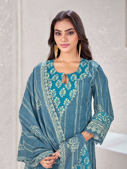 Teal Blue Printed Cotton Suit Set with Embroidered Neckline and Border Detailing