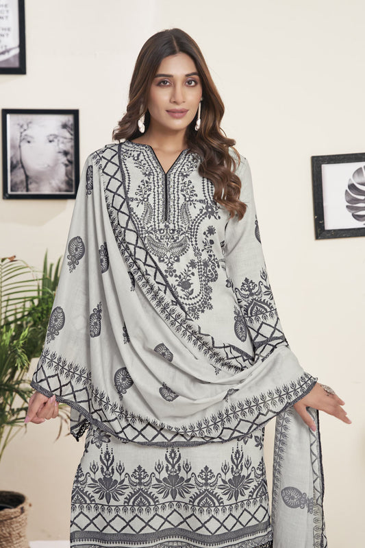 Women’s Cotton Printed Unstitched Suit Set with Dupatta – Grey & Black Ethnic Design