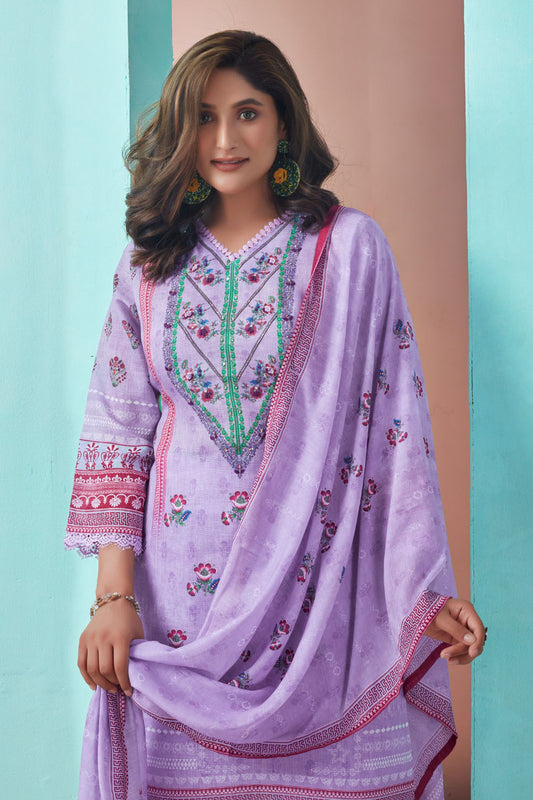 Lilac Embroidered Three-Piece Suit Set with Printed Dupatta
