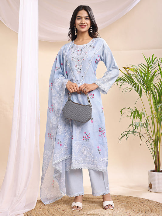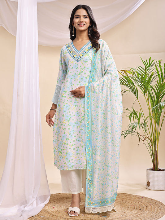 Turquoise Floral Printed Suit Set with Embroidered Neckline