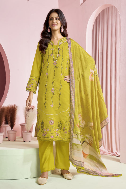Lime Green Floral Embroidered Suit Set with Printed Dupatta