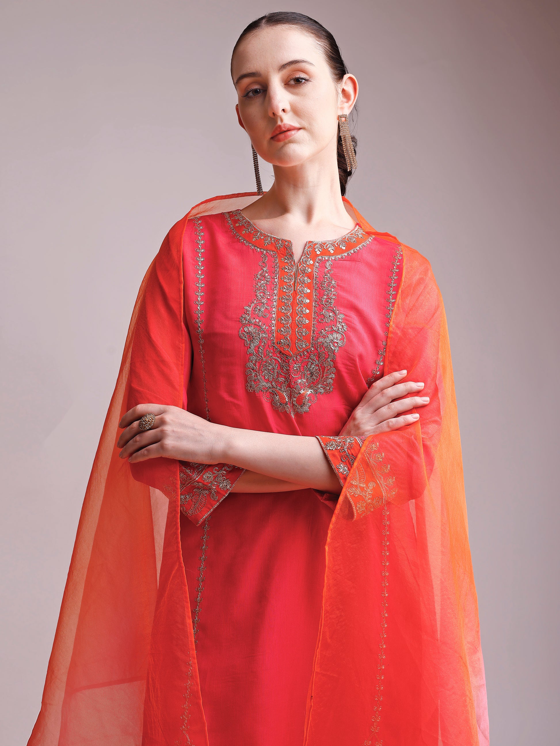 Coral Pink Embroidered Silk Kurta Set with Contrast Orange Dupatta