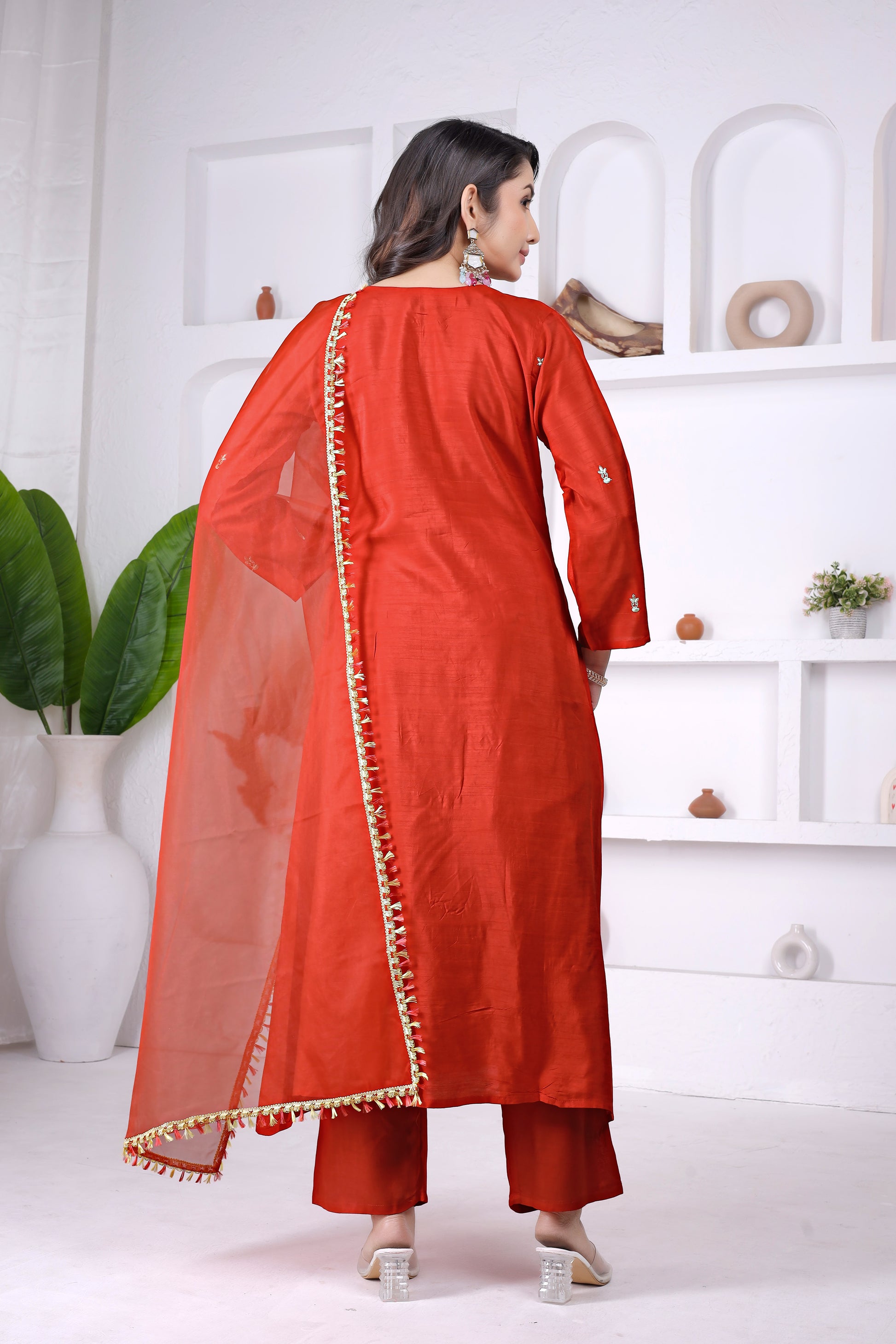 A stunning Crimson Red 3-piece viscose suit set featuring intricate thread embroidery on the yoke and sleeves. The Anarkali-style kurta is paired with matching straight pants and a beautifully bordered dupatta, making it perfect for festive occasions, parties and ethnic celebrations.