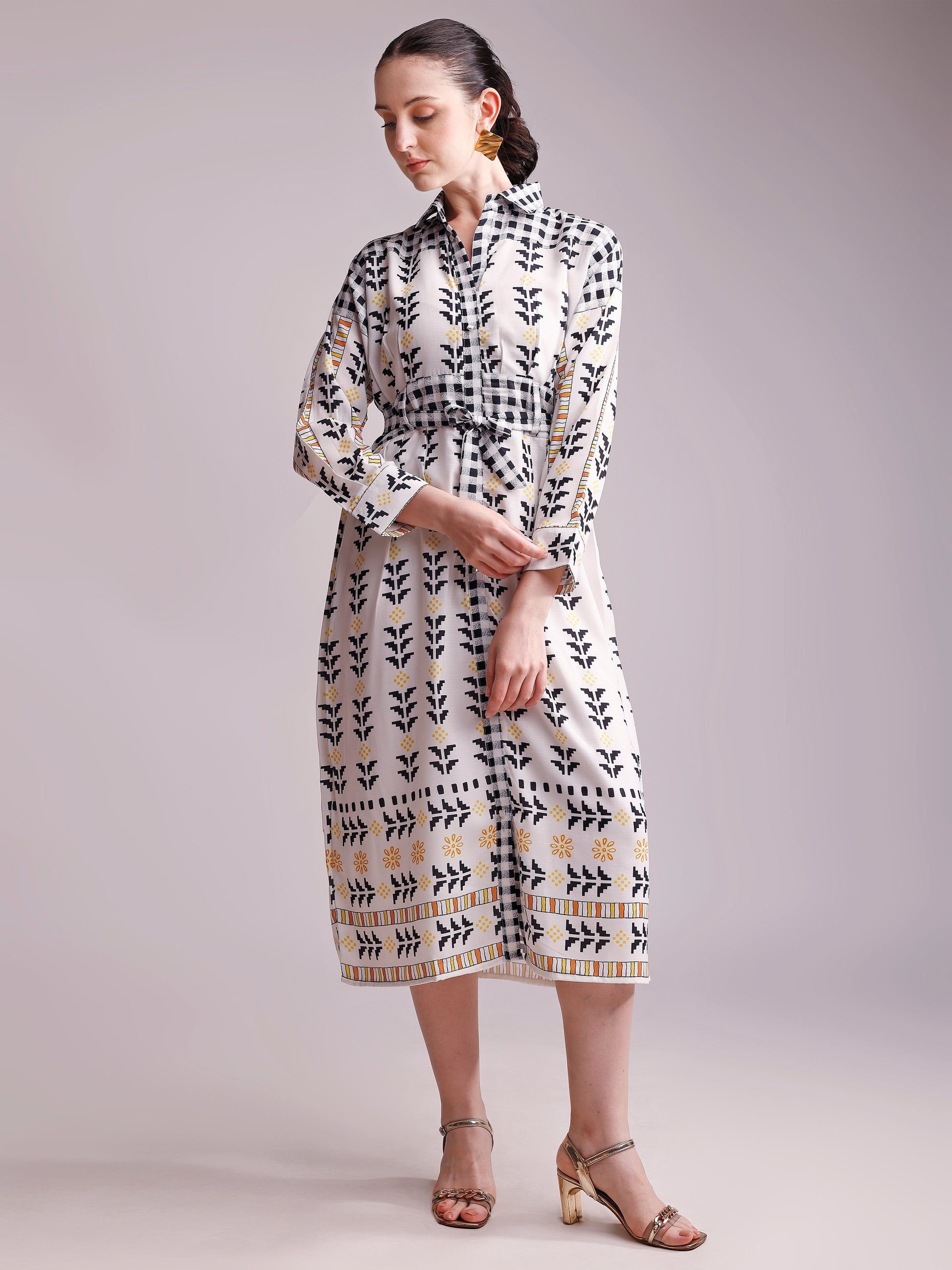Crafted from a soft, breathable fabric, it showcases a modern geometric and floral block print in contrasting hues of black and mustard, adding a touch of sophistication to your casual and semi-formal wardrobe. The midi length and relaxed fit make it perfect for brunches, workdays, or travel chic moments.