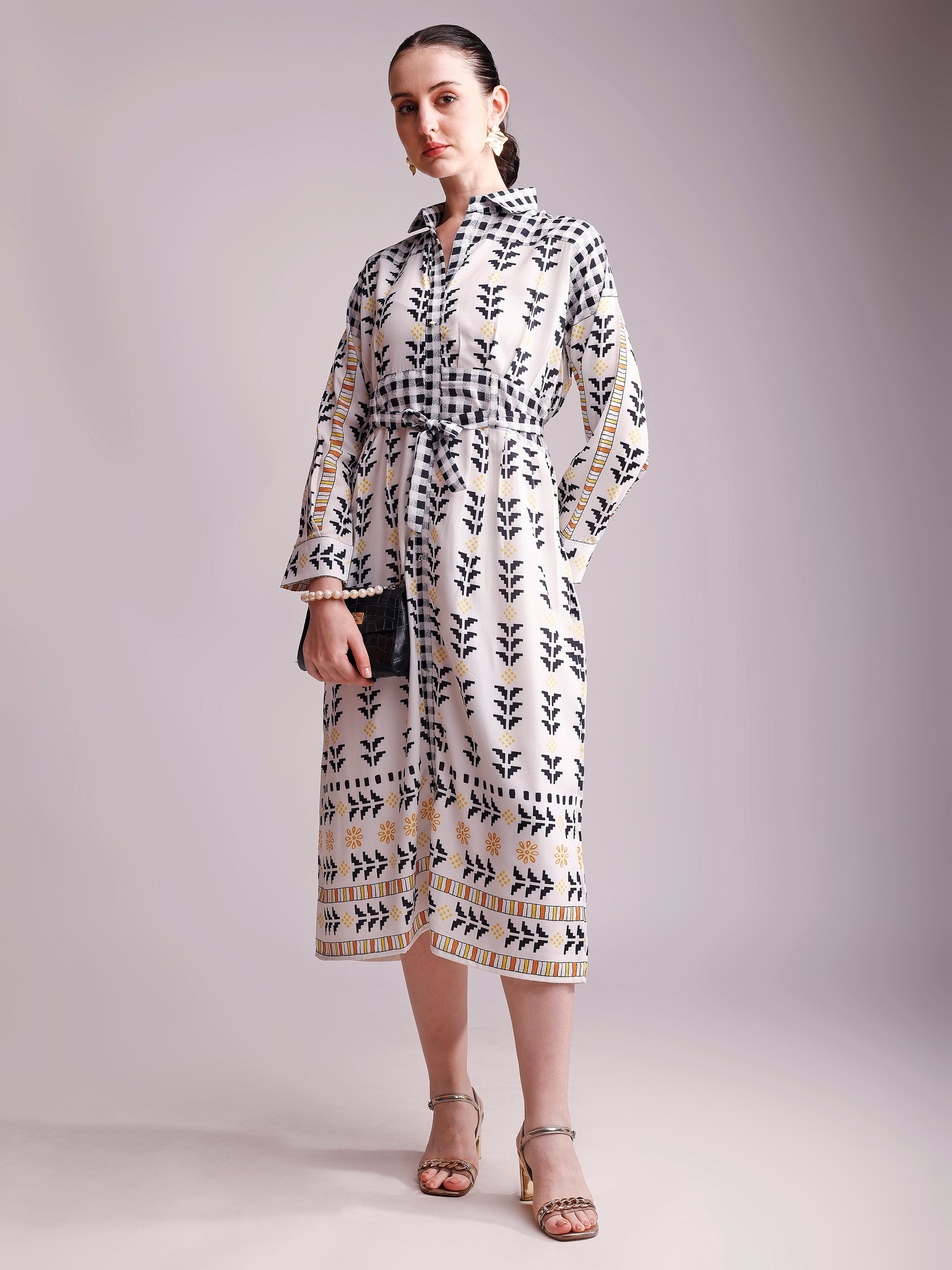 Off-White & Black Printed Shirt Dress with Waist Tie-Up